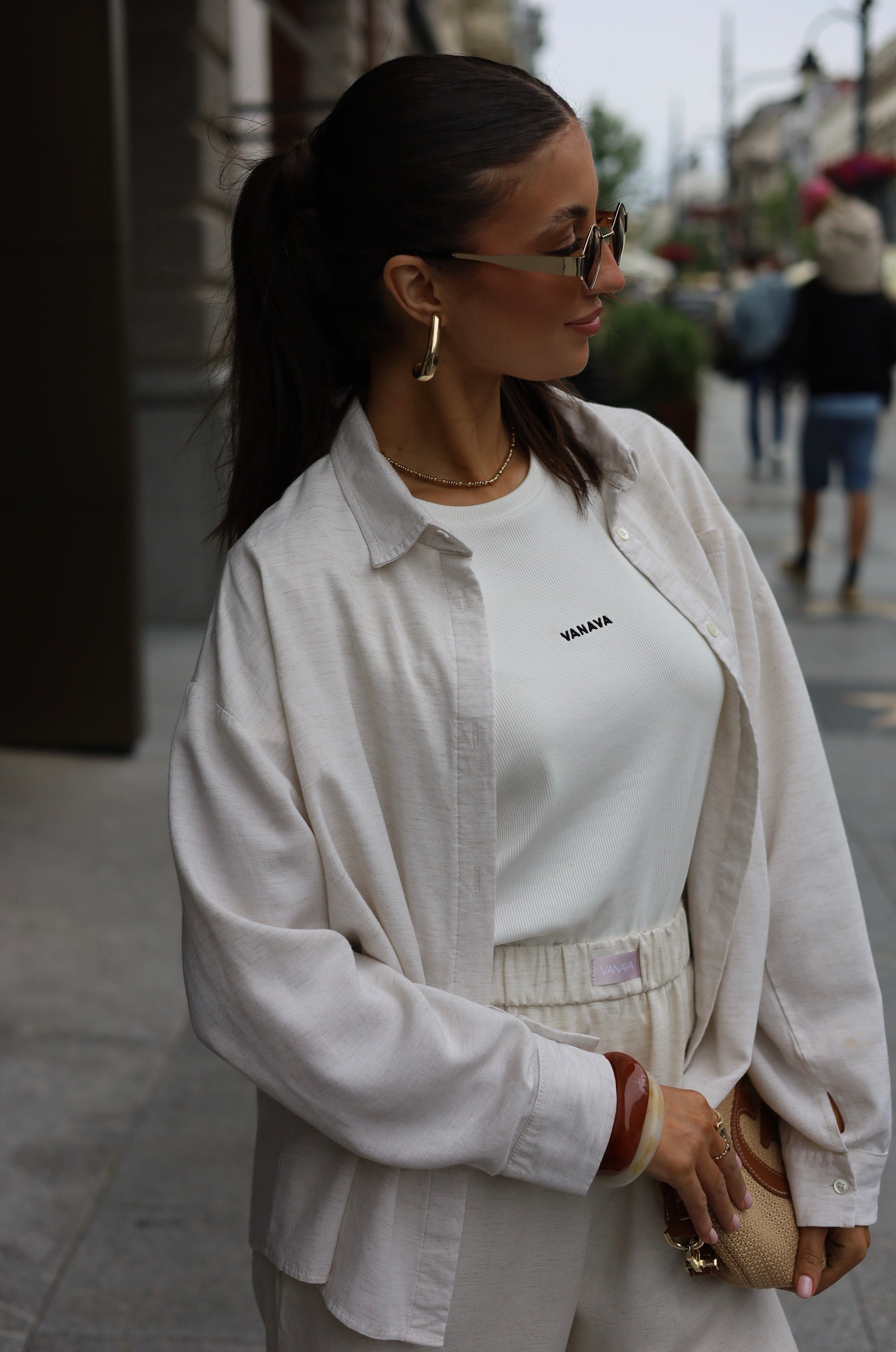 Lekka, oddychająca i niezwykle wszechstronna – ta koszula to letni niezbędnik w garderobie kapsułowej. Uszyta z mieszanki naturalnych tkanin: 85% wiskozy i 15% lnu, łączy w sobie miękkość, komfort i subtelną strukturę.